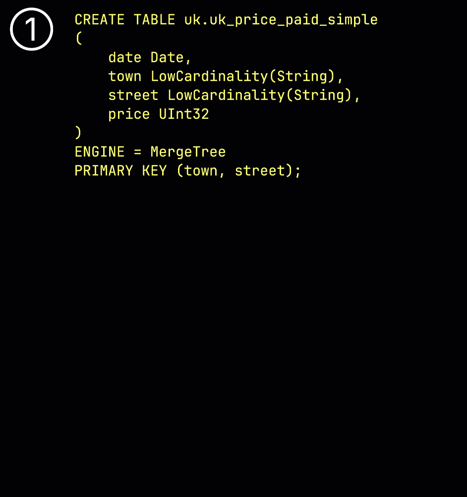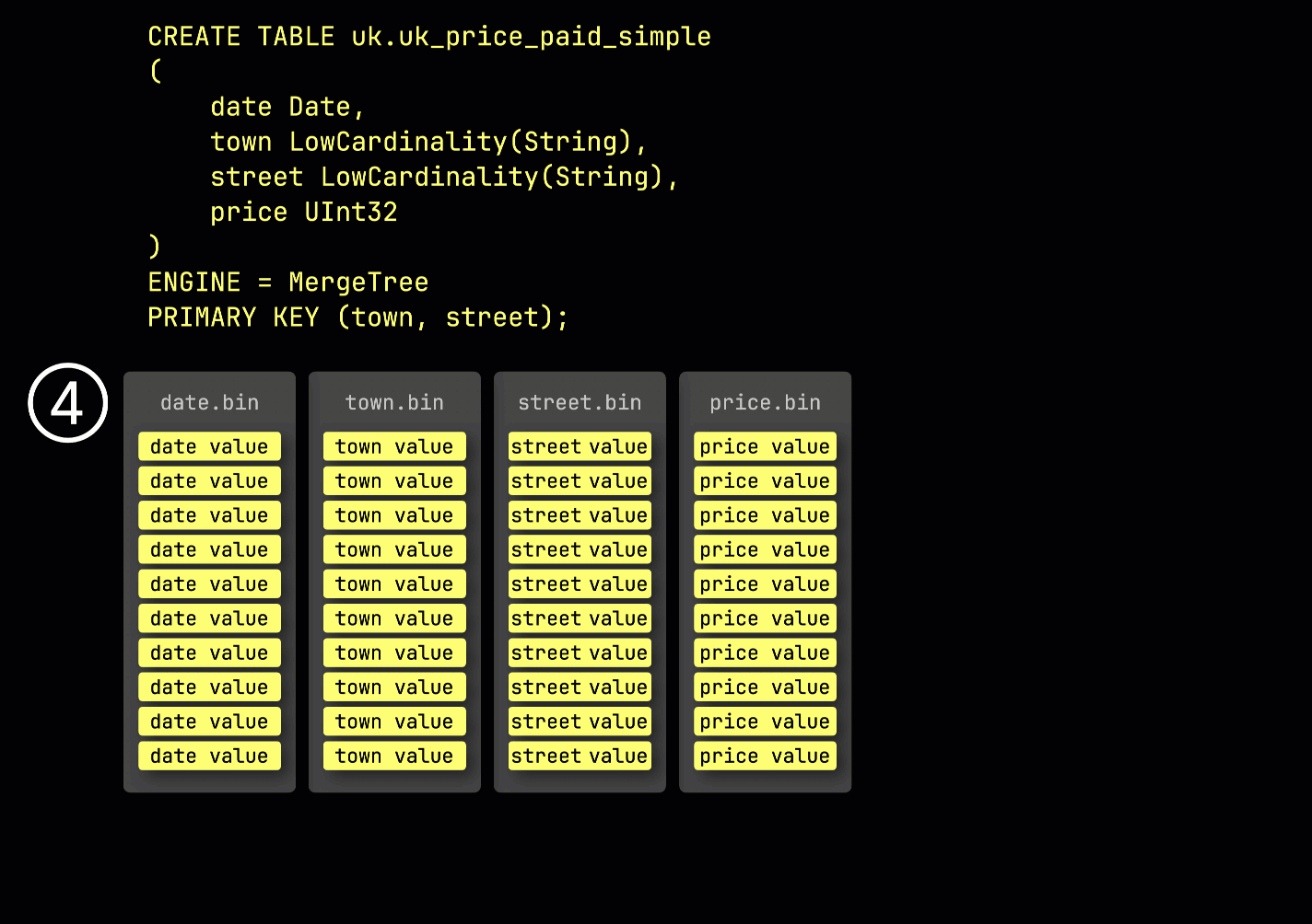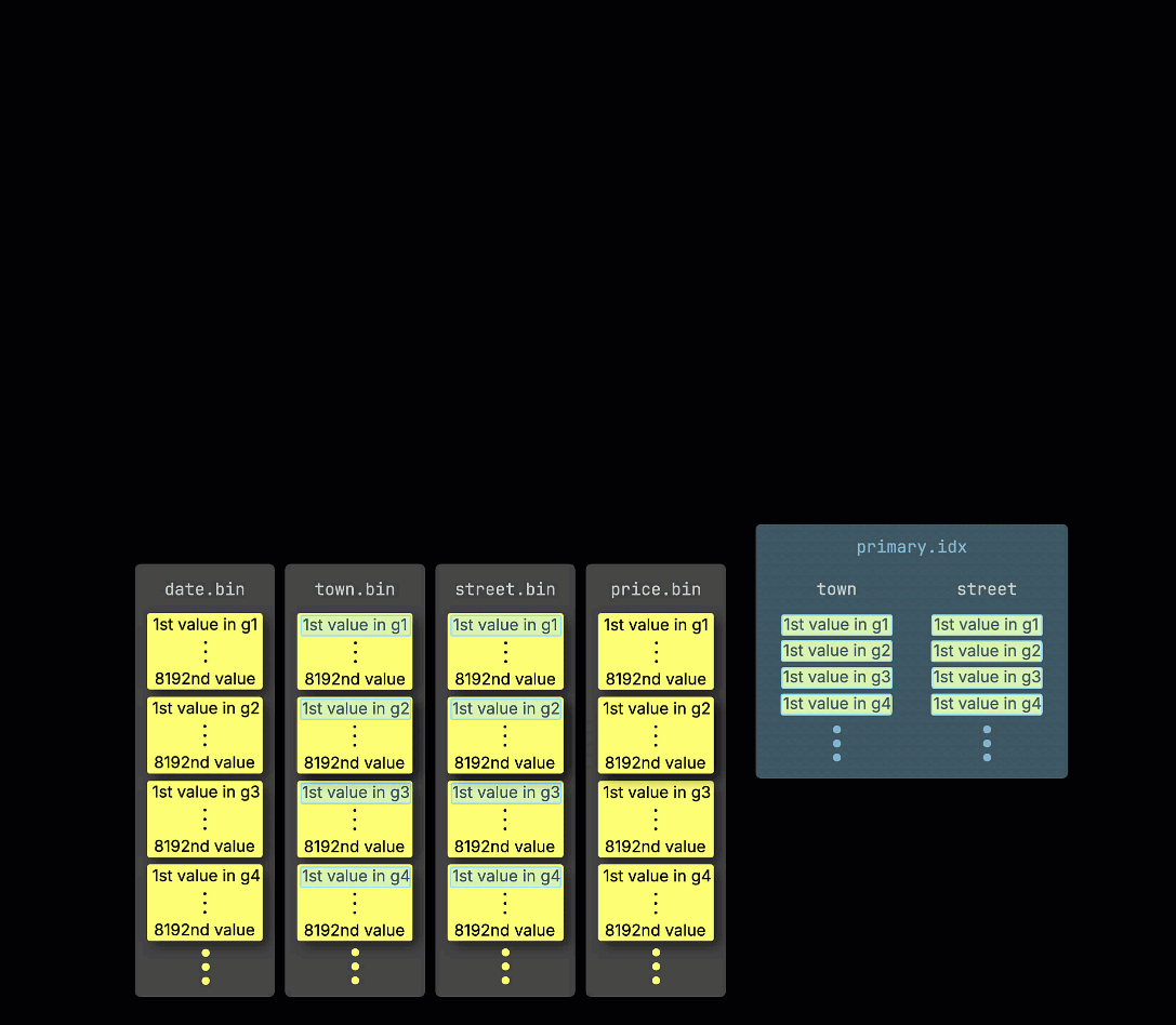 Как напоминание, в нашей ① примерной таблице с ^^primary key^^ (town, street) ② вставленные данные ③ сохраняются на диск в виде отсортированных по значениям столбцов ^^primary key^^ и сжатых данных, в отдельных файлах для каждого столбца: